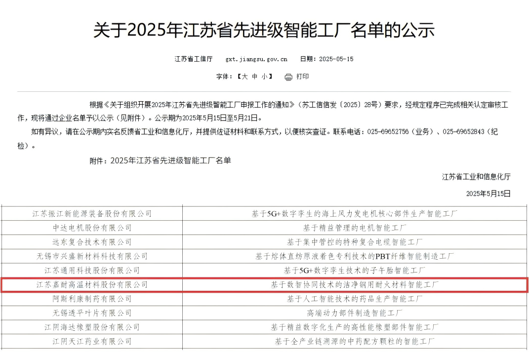 喜報(bào)!嘉耐股份入選江蘇省先進(jìn)級(jí)智能工廠